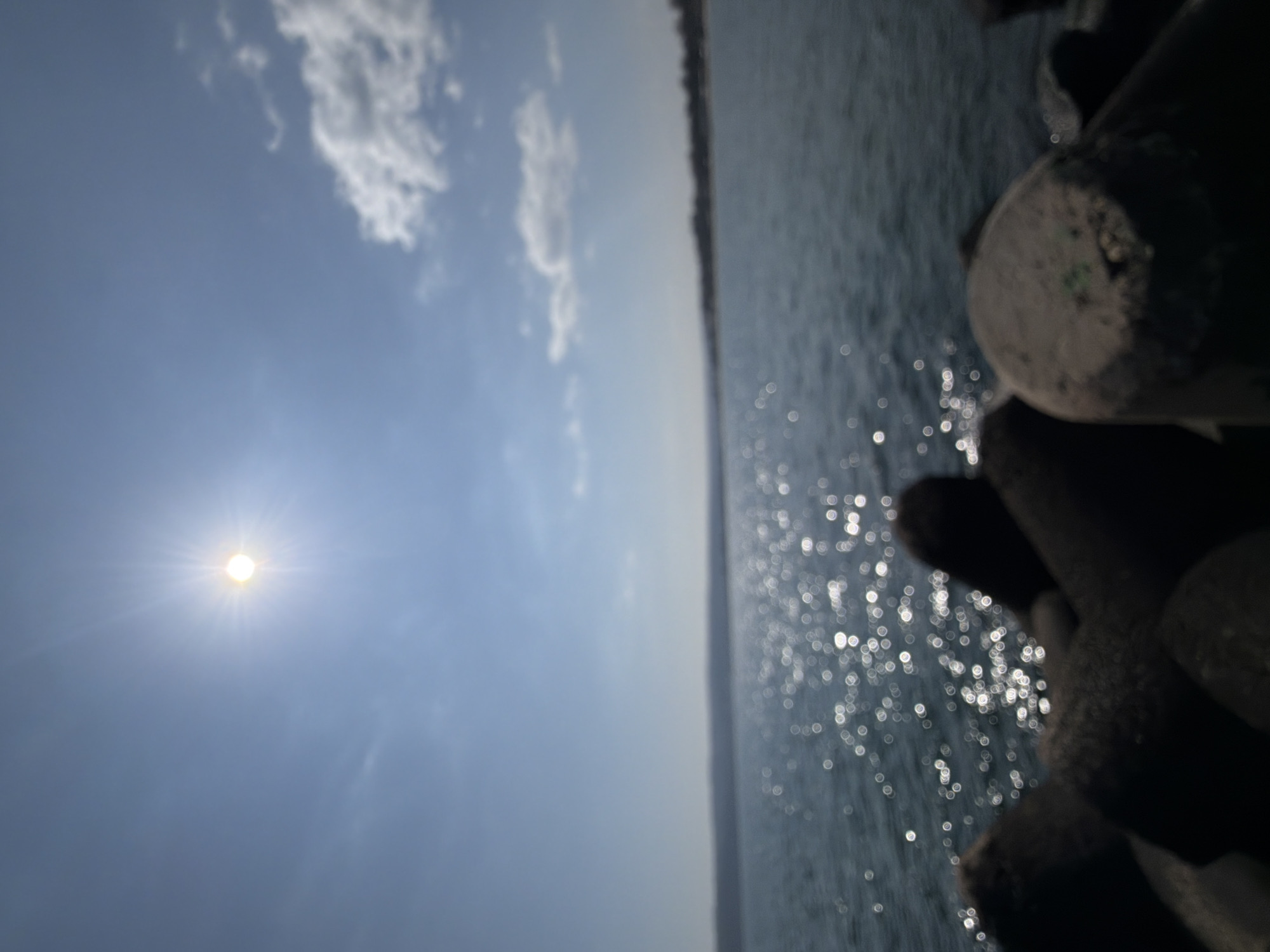 The image displays an outdoor daytime scene at the coast of Varna, Bulgaria. A brilliant, starburst sun is positioned in the upper-left quadrant of a predominantly clear blue sky, which also contains scattered white clouds towards the upper right. The mid-ground is dominated by an expanse of water, characterized by numerous sparkling, out-of-focus specular reflections from the sunlight. A distant, blurred horizon line reveals a dark strip of land, consistent with a vegetated or developed shoreline. The immediate foreground is occupied by several dark, indistinct concrete structures, likely breakwater elements or tetrapods, with one rounded structure in the lower right exhibiting surface irregularities. No individuals or discernible actions are present.