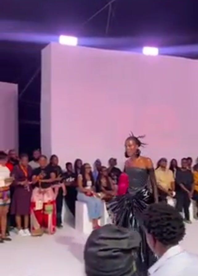 A model is walking on a runway in front of an audience. The model is wearing a black strapless dress and black opera gloves. The skirt of the dress is large and appears to be made of black plastic. The audience is seated in front of a plain white wall. There is a bright light above the runway, and speakers are visible at the top of the frame. Some audience members are taking photos or videos of the model.