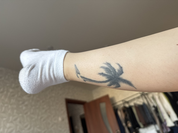 The image captures a human lower leg with light skin tone, positioned indoors in what is identified as Orekhovo-Zuyevo, Russia. A white, ankle-length sock is worn on the foot and ankle, showing minor wear. On the outer side of the lower leg, above the sock line, a faded black and grey tattoo depicts a palm tree with a surfboard or wave. The background includes a light-colored, patterned wallpaper on the left, and a partially open reddish-brown wooden door on the right. Behind the door, a blurred clothing rack filled with various dark garments is visible. The upper portion of the image shows a plain light-colored ceiling. Illumination is consistent with ambient indoor lighting.