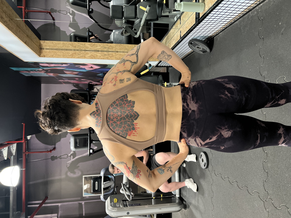The image displays the interior of a gym in Tel Aviv, Israel. In the foreground, a person with short, dark, undercut hair stands with their back to the camera, hands placed on their hips. They wear a light brown sports bra revealing a large black and red geometric tattoo with red drip elements on their upper back. Their left arm features tattoos including a stylized red and black bird, a blue rose with a stem, and black script. Their right arm shows a cherry blossom branch, two Japanese characters, and a small animal head on the bicep. They are wearing dark purple and black tie-dye leggings. In the mid-ground to the left, a male in a dark top, shorts, and white sneakers sits on a gray and yellow leg exercise machine, facing away from the camera. A black Olympic weight plate rests on the dark gray interlocking rubber mat flooring nearby. The gym walls are dark gray with large monochromatic murals depicting figures and equipment. The ceiling is an exposed industrial style with red pipes and white cone-shaped light fixtures. A large, wooden-framed mirror on the right reflects parts of the gym and a green water bottle on a black mesh shelf beneath it. Another black Olympic weight plate is visible near the base of the mirror.