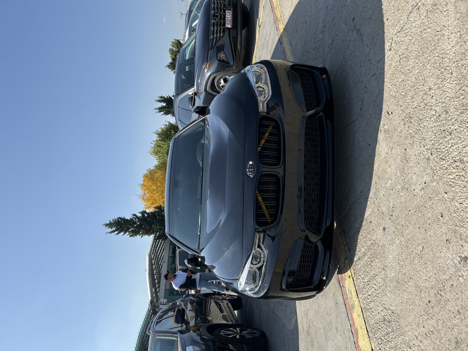 The image displays an outdoor vehicle parking area, identified as likely being in Rustavi, Georgia, under a clear blue sky. In the foreground, a black BMW 3 Series sedan (F30 generation) with an M-sport style front bumper and grille is prominently parked, facing the viewer. The vehicle features yellow strut bars visible through its black grille and a circular black-and-silver emblem on the hood, replacing the standard BMW emblem. To the left of the BMW, a dark-colored Subaru Forester SUV is partially visible, parked. To the right, a dark gray fourth-generation Hyundai Tucson SUV is parked, displaying a Georgian license plate with the registration "9201 CM." One adult male is present in the mid-ground, standing to the left of the BMW, between it and the Subaru. He is attired in a white long-sleeved shirt worn over a dark t-shirt, light-colored pants, and a dark baseball cap, appearing to observe an object held in his hands. The ground surface consists of concrete or asphalt, marked with faded yellow and red lines. In the background, a modern building with a multi-tiered roof structure and glass panels is visible, along with several trees, including a tall conifer and one exhibiting vibrant yellow autumn foliage.
