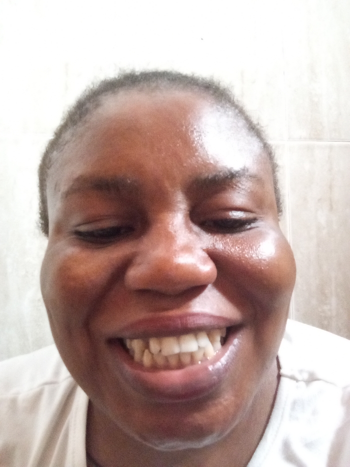 The image presents a close-up portrait of an adult individual of African descent. The subject has dark skin, short dark hair, and is looking directly towards the camera with a wide, open-mouthed smile, revealing both upper and lower teeth. The eyes are narrowed, and the forehead and cheeks, particularly the left cheek (viewer's right), exhibit a pronounced glossy sheen. The left side of the face, specifically the mid-cheek area, appears notably fuller than the right side. The individual is wearing a plain, light-colored, crew-neck top. The background is a light-colored tiled wall, featuring rectangular tiles and visible grout lines, indicative of an indoor setting. No specific geographical markers are present within the image to identify the location as Lagos, Nigeria.