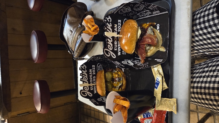 The image displays a meal served on a black plastic tray within a Jenkin's restaurant in Valencia, Spain. Two gourmet burgers, presented in black cardboard wraps branded "Jenkin's EUROPEAN WINNERS 2023," are the central focus. The burger on the left features double patties, melted cheese, and prominent pickle slices. The burger on the right includes a single patty topped with melted cheese and strips of bacon. Two portions of sweet potato fries are served in black paper cups. Adjacent to the food on the tray are multiple condiment packets, including red and gold varieties. A brown leather-like bag rests on the light-colored tabletop to the right of the tray. In the background, three red-upholstered bar stools are visible against a wooden paneled wall. The photograph is taken from a seated perspective, with the lower legs of an individual, dressed in black and white checkered pants, visible at the bottom of the frame. The food appears untouched.