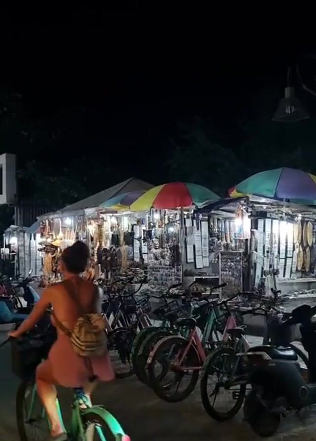 At night, a line of rental bicycles sits parallel to street vendor stalls. The stalls have colorful awnings and are selling various handcrafted souvenirs, clothing, and jewelry. People are riding bicycles and mopeds down the road along the stalls. The night sky is dark and the stalls are illuminated by lanterns and lights.