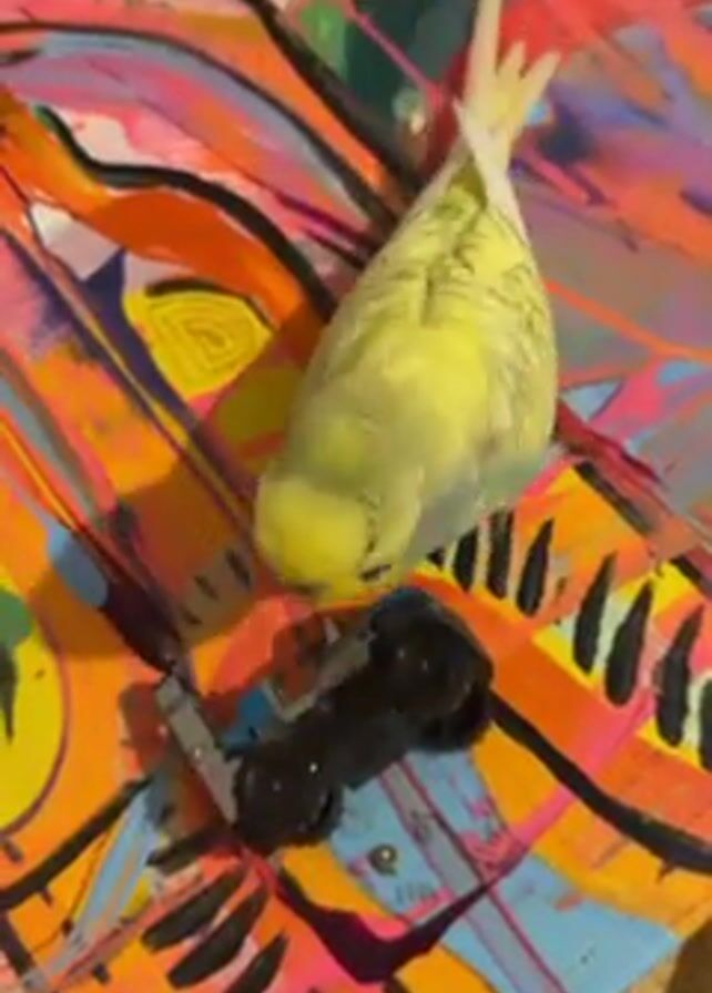 - "A yellow budgerigar, also known as a parakeet, interacts with a black toy truck on a colorful, abstract painting" by FM-rE8HA3, licensed under CC BY 4.0