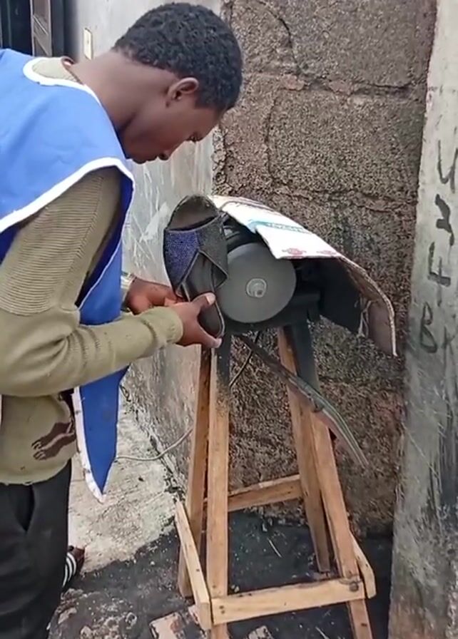 A man stands to the left of the frame in front of a cinderblock wall. He uses a grinding machine to buff the sole of a black sandal with a blue pattern. He is wearing a blue apron with a white trim. The grinding machine is set on top of a wooden stand. The machine is partially covered in a sheet of paper that is secured to it with tape. The man is holding the sandal with both hands and pressing it gently to the grinding wheel.