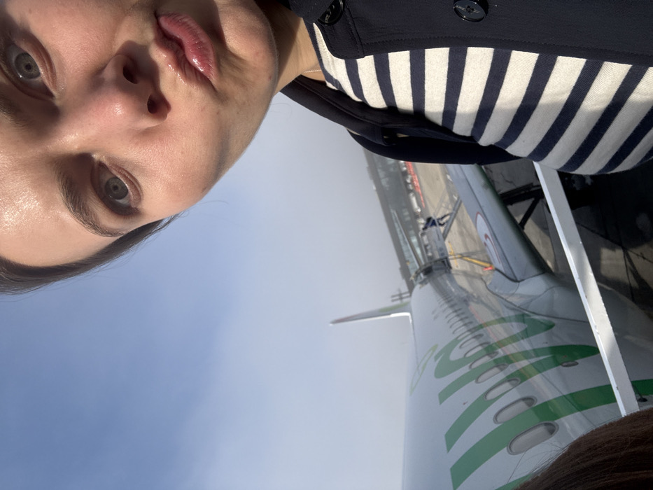 A selfie shows a person with pale skin, striking grey eyes, and glossy lips, wearing a navy and white striped top with a buttoned jacket. The camera angle is from above, with the person's face occupying the upper left. The background features a hazy sky and part of an airplane, possibly an Alaska Airlines plane, with its tail fin and green accents visible. The scene suggests travel or boarding an aircraft.