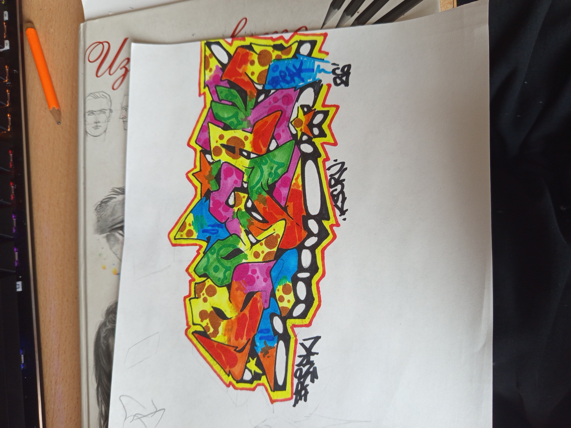 A drawing of colorful graffiti art is centered on a white sheet of paper. The style is abstract, with various colors and shapes overlapping and interconnected. The primary colors present are green, pink, yellow, orange, and blue. The image features a yellow outline with black and white spots highlighting the outline. The drawing is laid on top of another sketchbook, visible to the left, which contains some pencil sketches, including at least one human face. Next to this is an orange pencil. A keyboard is visible on the far left. A dark object is present on the right. The location in the city of Unknown, Unknown, is not visible in this image.