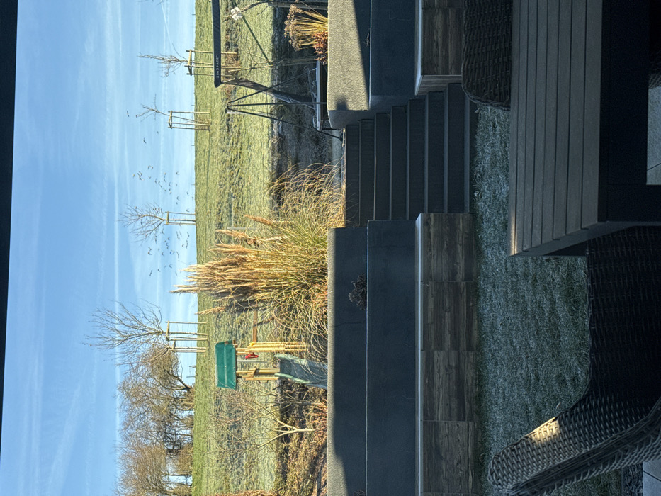 The image depicts an outdoor residential garden area overlooking a frosted rural landscape in Junglinster, Luxembourg. In the foreground, part of a dark woven outdoor chair and a dark rectangular outdoor dining table are visible on a paved patio, with frosted green grass beyond. The midground features a multi-tiered garden design with dark grey retaining walls and a set of dark grey steps leading upwards. The base of the lower retaining wall is clad with horizontal wood-patterned tiles. To the left of the steps, a large clump of golden-brown pampas grass stands. To the left and at a lower elevation on the frosted ground, a wooden children's playset with a green roof and grey slide is visible. To the right, also at a lower elevation, a dark metal swing set is positioned. The background consists of a gently sloping grassy hill covered in frost, with numerous bare deciduous trees, several supported by wooden stakes. A large flock of dark birds is in flight against a clear, bright blue sky. No individuals are present, and no actions or interactions are occurring. The scene is illuminated by natural sunlight, casting shadows and highlighting the frost.