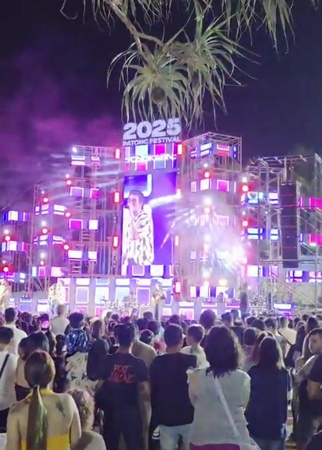 live outdoor concert at night. A large stage is visible in the background with "2025 PATONG FESTIVAL SONGKARN" displayed on top. The stage is illuminated with colorful purple and blue lights, and a large screen shows a close-up of the lead singer. The band is performing on stage with a drummer, guitarist, and possibly others. A large crowd of people is gathered in front of the stage, facing the performance. Some are standing, while others are seated. The crowd includes people of various ages and ethnicities, dressed in casual attire. Some individuals are recording the performance with their phones. There are palm trees in the foreground, partially obstructing the view of the stage. Red smoke or fog is seen to the left of the stage, adding to the atmosphere. The overall setting is a lively festival or concert event.
