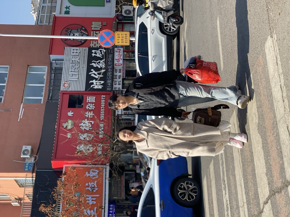 The image depicts two individuals, a female and a male, crossing a street on a pedestrian zebra crossing in a commercial area of Taihe District, China, under bright sunlight