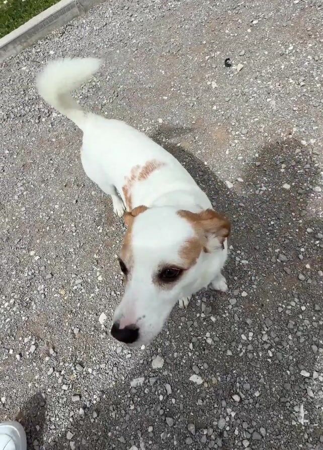 A light-skinned woman with long blonde hair braided into two pigtails squats on a gravel path outside a modern building. She wears a black leather jacket, black pants, and white shoes. A small, white dog with light brown markings faces her and tugs at one of her braids. The dog wears a red collar. The video appears to be a selfie taken by the woman. There are patches of green grass with white flowers visible in the background.