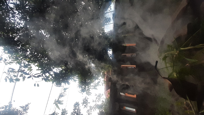 The image depicts an outdoor scene in Lhokseumawe, Indonesia, characterized by a substantial volume of light gray smoke originating from the lower center. A small fire, burning organic material consistent with garden waste or dry foliage, is visible at the bottom of the frame, obscured by the rising smoke. Green plant stalks and leaves are present in the immediate foreground, partially covered by the smoke. In the midground, a dark gray concrete wall with multiple evenly spaced, rectangular openings, each featuring an orange-brown inner frame, spans horizontally. Above and behind this wall, sections of a residential building's orange-tiled roof are discernible. The upper portion of the image is dominated by dense green tree foliage, through which the smoke ascends. Bright sunlight is visible through gaps in the canopy, and thin utility lines traverse the upper left sky area. No individuals are present in the scene.