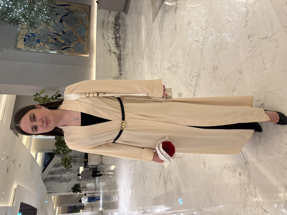 A female subject stands centrally in a well-lit, luxurious indoor environment, identified as a hotel lobby or high-end commercial space in Dubai, United Arab Emirates. She has dark brown hair, parted in the middle, and faces forward with a neutral expression. She wears a full-length, light beige/cream open abaya-style coat, cinched at the waist by a slender black belt with a gold-colored rectangular buckle. A black top is visible beneath the coat, along with black trousers and black pointed-toe heels. She wears a silver-colored necklace with a snake pendant and small stud earrings. A white shoulder bag with gold hardware hangs from her right shoulder. In her left hand, she holds a single red rose wrapped in white paper. The floor consists of polished white and grey marble with visible reflections. The background features light grey walls, decorative textured stone panels, and potted plants. To the left, two blurred individuals are seen walking away. On the right, a large stylized wall artwork with blue and gold abstract designs is mounted, accompanied by a decorative tree-like element. The architecture includes pillars and integrated lighting, indicative of a modern, upscale venue.