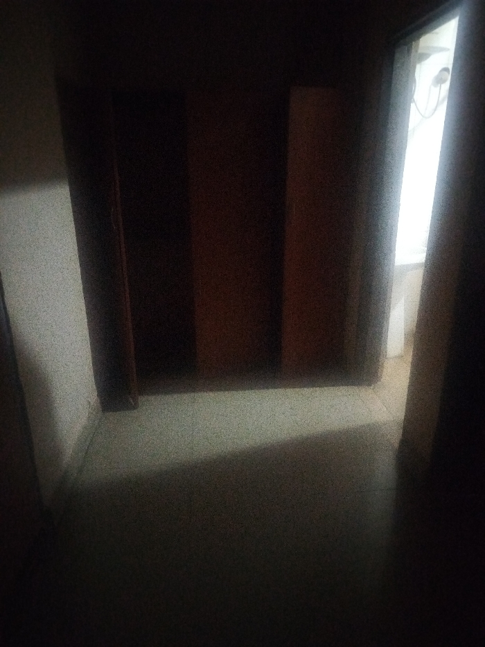 An interior shot presents a dimly lit hallway with brown wooden doors or partitions along one side. The floor is light-colored, possibly tile or linoleum, with dark shadows stretching across it. At the end of the hallway, a brightly lit room is visible through a doorway, creating a strong contrast in illumination. The overall scene suggests a closed-off or transitional space within a building.