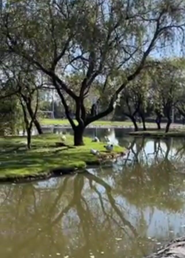 small island in a pond or lake. The island is covered in grass and has several trees growing on it. There are a number of white ducks resting on the grass near the water's edge. The water reflects the trees and sky. In the background, a soccer field is visible. The day appears to be sunny.