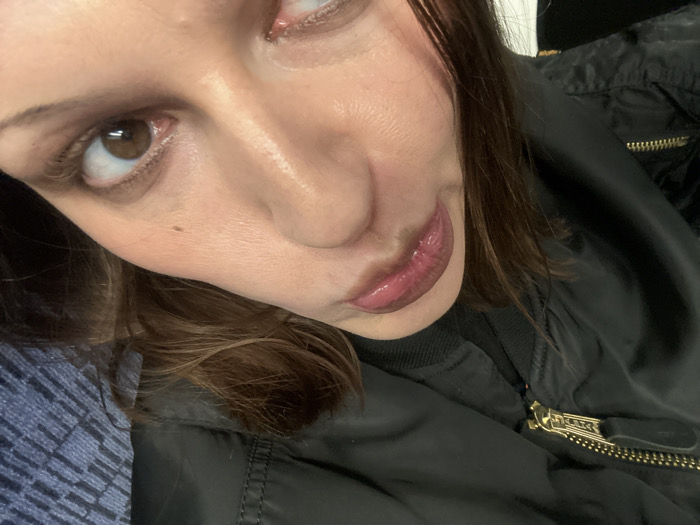 A close-up selfie of a woman with brown eyes, slightly pursed lips with pink gloss, and light skin
