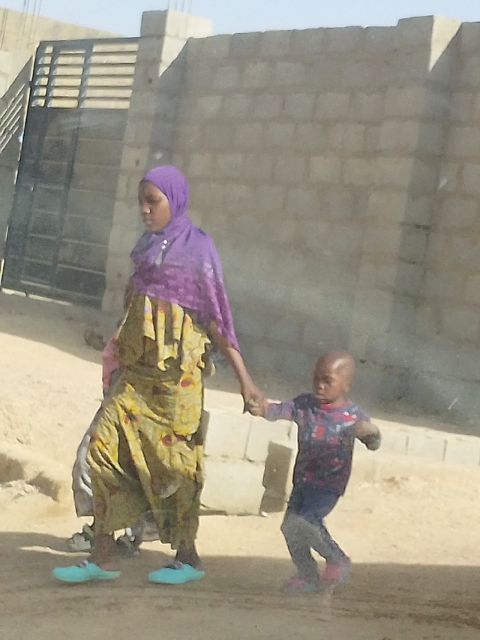 This image captures an adult female and a young child walking on a dirt path in Mariri, Nigeria, during daylight