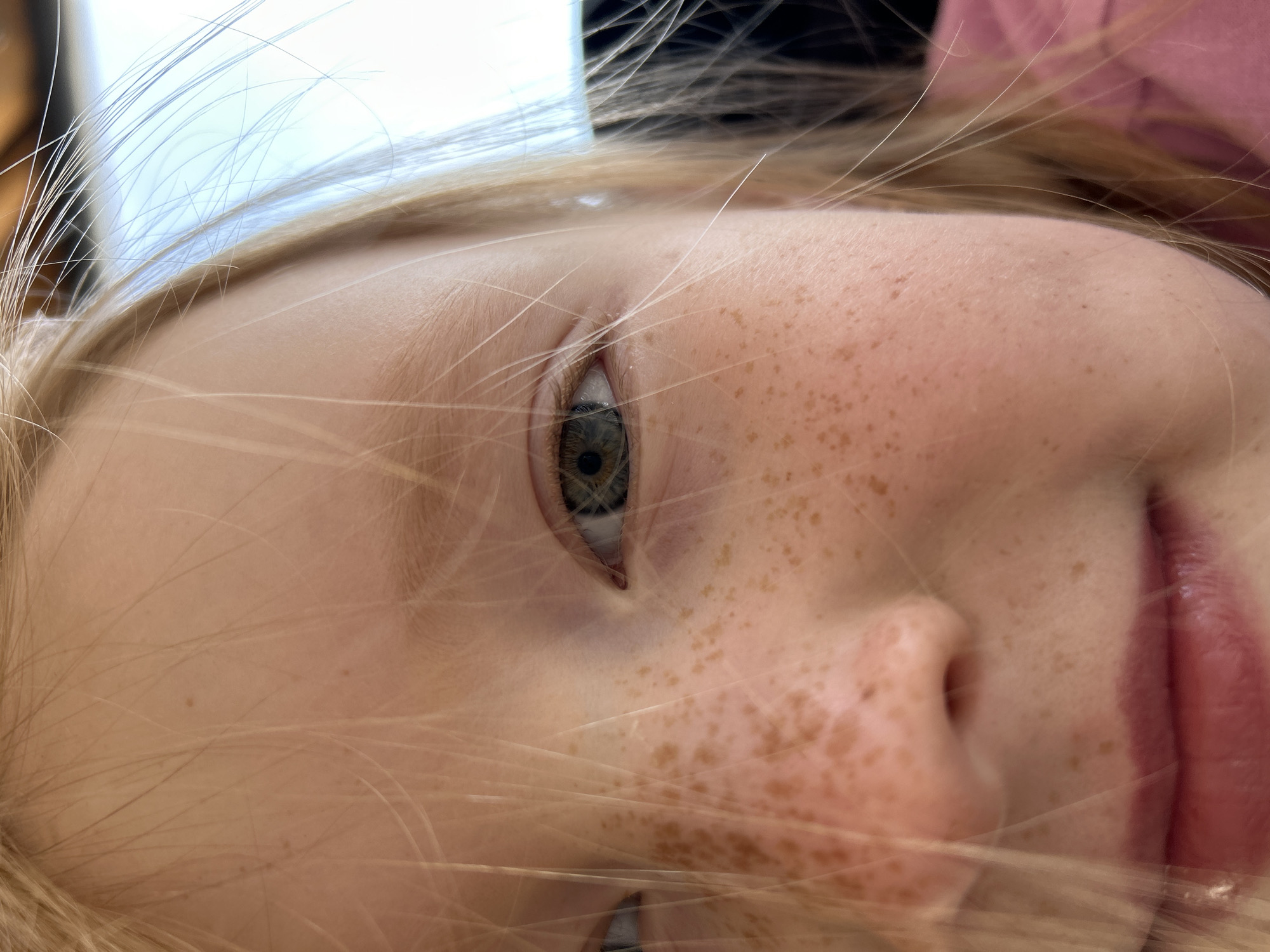 A close-up of a young person's face, freckled and with blond hair partially obscuring the view