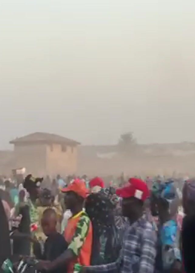 A large crowd of people is gathered in a dusty, outdoor environment
