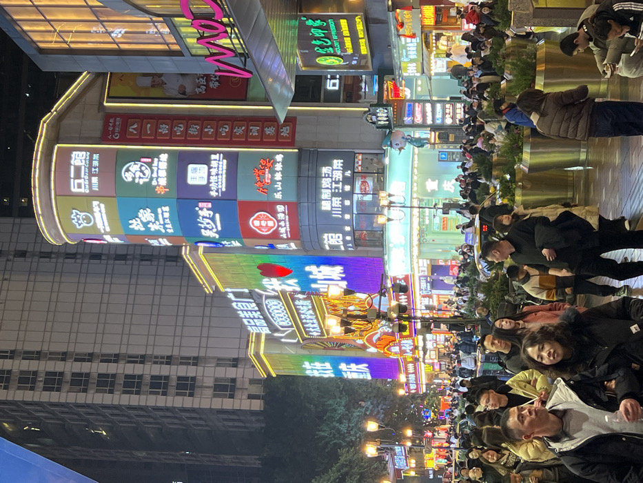 The image captures a densely populated urban street scene at night in Yuzhong District, China
