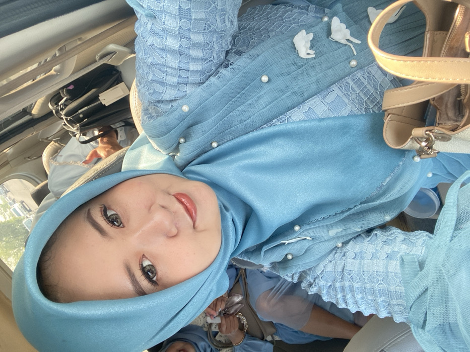 The image captures a selfie taken inside a vehicle. The primary subject is a woman, likely of East Asian descent, wearing a light blue hijab and a matching light blue dress or top. The garment features lace sleeves and a sheer outer layer adorned with white pearls and small white, possibly floral, appliques. She has light makeup, including defined eyebrows, eyeliner, and reddish-brown lipstick, and is smiling faintly while looking directly at the camera. To her left and slightly behind, another individual is partially visible, also dressed in light blue, holding a small white object. The vehicle's interior features light-colored seats. Behind the main subject, a black handbag with a white tag hangs on the seat. A light-colored purse with gold-toned hardware is visible in the lower right foreground. Through the vehicle's window in the background, an outdoor scene is visible, showing a road with parked or moving vehicles under daylight conditions. The specific location within Pamotan, Indonesia, cannot be determined from the visual information presented.