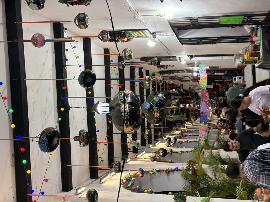 - "Inside a bustling market, painted skull decorations hang from the ceiling amid strings of colorful lights" by FM-Ft7F82, licensed under CC BY 4.0