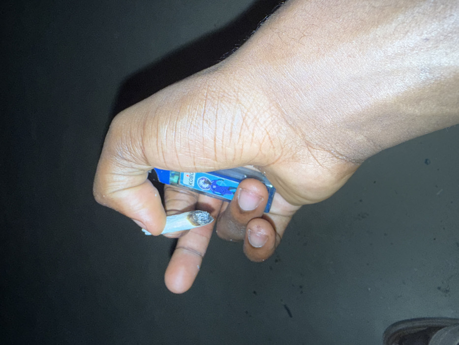 A dark-skinned hand holds a lit cigarette between the index and middle fingers