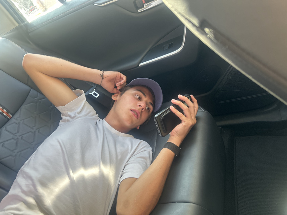 An interior shot depicts a young male lying across the black leather rear seats of a vehicle, potentially a modern SUV such as a Toyota RAV4 due to the geometric pattern on the seatback