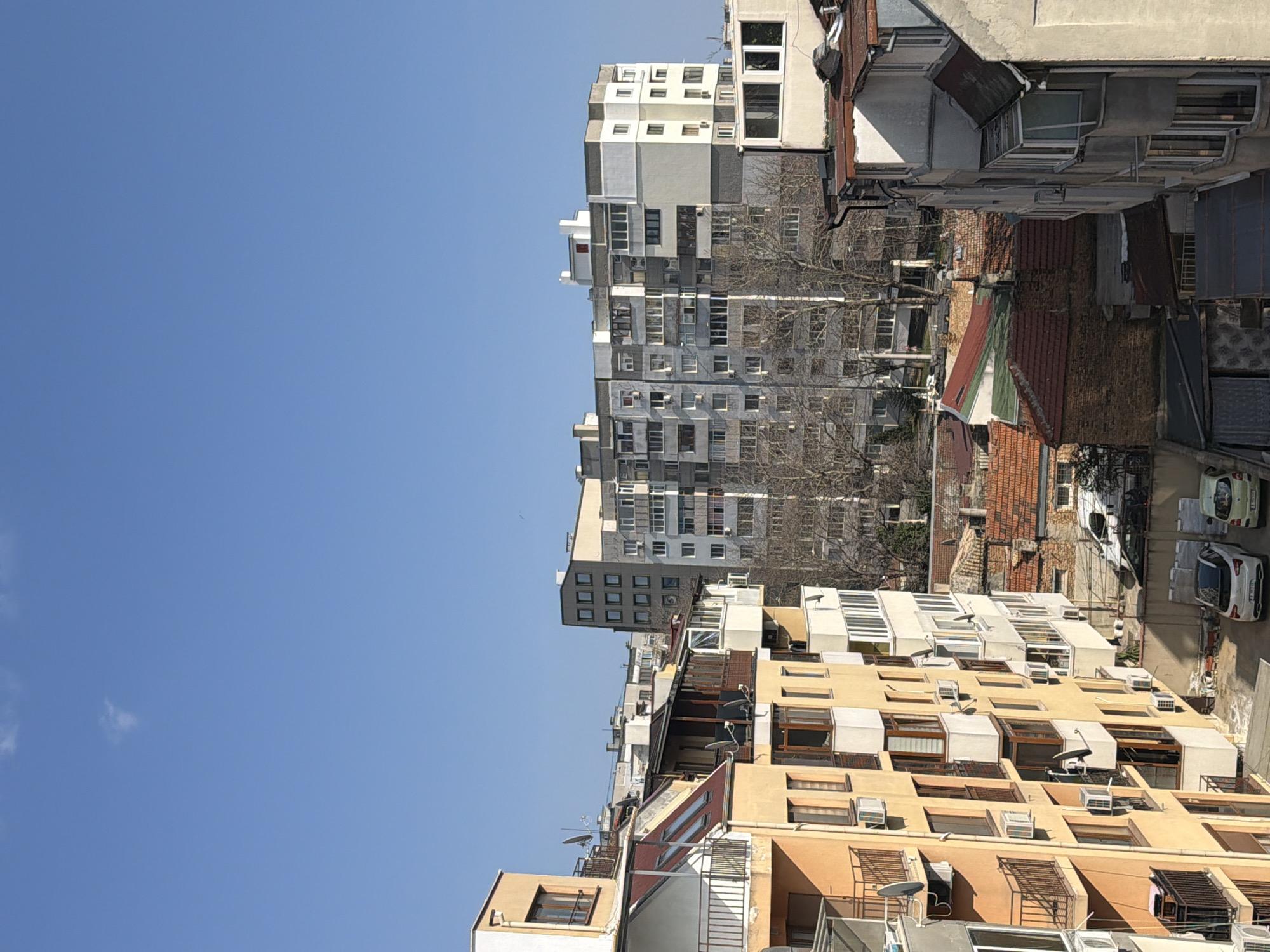 The scene depicts a dense urban residential area in Varna, Bulgaria, viewed from an elevated perspective under a clear, bright blue sky with a single faint cloud. In the prominent left foreground, a multi-story residential building features light orange and white facades, equipped with numerous windows, open balconies with dark railings, enclosed glass balconies, and multiple exterior air conditioning units and satellite dishes. Its visible roof section is reddish-brown with integrated skylights. Below this structure, a paved ground-level area serves as a parking space for two vehicles: a white Citroën C4 Cactus and a smaller, light-colored compact car. Dominating the midground and background are multiple larger, multi-story apartment blocks, characterized by facades in shades of grey, white, and pale yellow. These buildings display numerous rectangular windows, some with external blinds or enclosed balcony extensions. Between these taller structures and in the lower midground, several smaller, older buildings with distinctive red-tiled roofs are visible. Bare-branched deciduous trees are interspersed throughout the midground, suggesting a winter or early spring season. No individuals, explicit actions, or interactions are discernible within the frame.