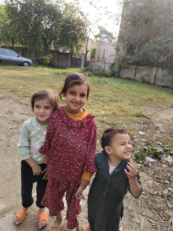 - "Three young children pose in a grassy outdoor setting with a neutral-toned building and a silver car visible in the background" by FM-uPtwu2, licensed under CC BY 4.0