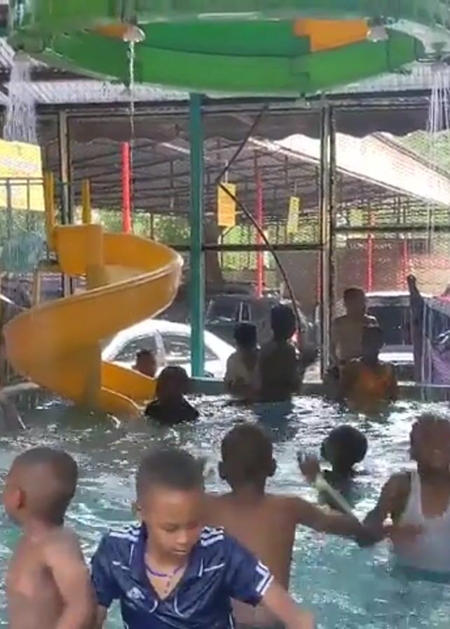 group of children, mostly shirtless, enjoying themselves in a brightly colored indoor water park. The pool is surrounded by playground equipment, including a red slide and a yellow spiral slide. Water is cascading down from overhead structures, adding to the fun. Adults can be seen supervising the children. The atmosphere appears lively and joyful, with the kids splashing and playing in the water. The park is enclosed by walls with window openings revealing the outdoors.