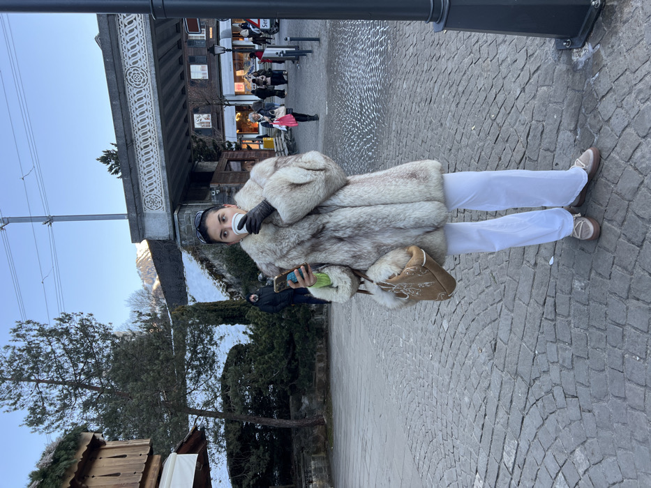 The image displays a woman standing on a cobblestone street in Gstaad, Switzerland, during daylight. She is centrally positioned, wearing a light-colored fur coat, white wide-leg pants, and light brown loafer-style shoes. Black gloves cover her hands; her right hand holds a white disposable cup to her mouth, while her left hand holds a smartphone featuring a blue PopSocket. A light brown, fur-trimmed bucket bag with white embroidery hangs from her left shoulder. Dark sunglasses rest on top of her head. To her left, a wooden chalet-style building with a distinctive roof and evergreen trees are visible. Further back on the left, a man in a dark jacket holds a phone. In the mid-ground, an ornate concrete or stone overpass, decorated with repeating circular motifs, spans the scene, with overhead power lines crossing above it. Beyond the overpass to the right, a commercial street features multiple pedestrians, traditional buildings, and a clearly visible "Hermes" sign. Snow-capped mountains are present in the distant background under a clear blue sky. The ground is paved with grey cobblestones arranged in an arc pattern. A black lamppost is partially visible on the far right side of the frame.