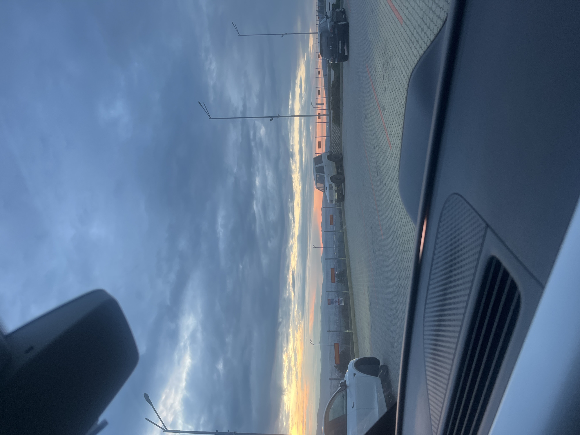 view from inside a car, looking towards the outside. The vehicle is parked on a paved surface with painted red lines. In the distance, there is a line of parked vehicles of various types, including a white SUV. Streetlights are visible along the paved area. The background features a cityscape with a sunset or sunrise peeking through the horizon, creating a gradient of colors in the sky. The sky itself is filled with clouds. The location appears to be in an industrial or parking area, with features characteristic of an urban setting. The city of Ihtiman, Bulgaria, is mentioned, implying that the photo was taken in or near this city.