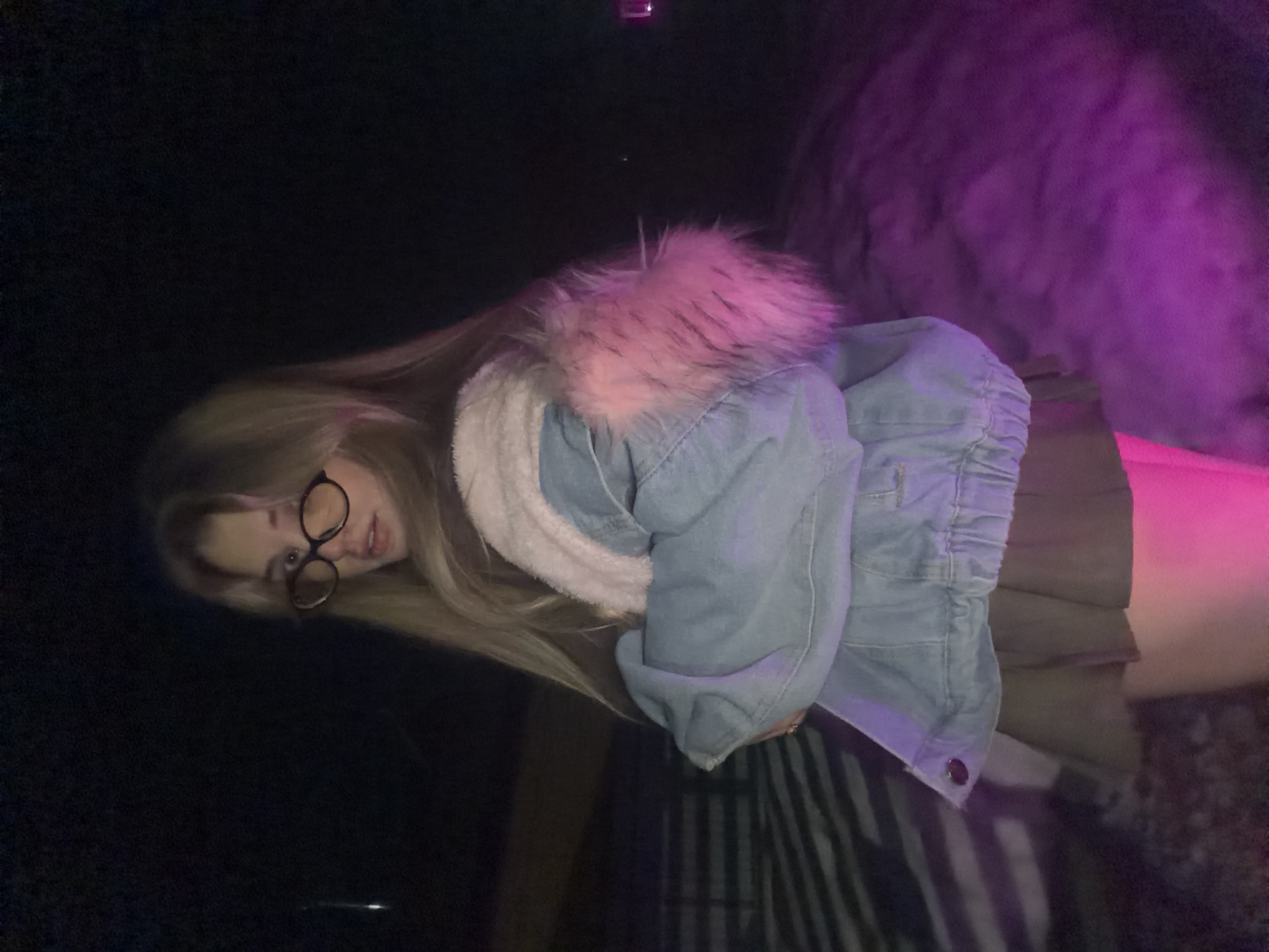 A young woman with long blonde hair and wearing round glasses is shown in an indoor setting. She is wearing a light blue denim jacket with a white fur lining and a pink fur collar. She is also wearing a dark skirt. The background is dark, but there is a pink or purple light illuminating part of the background on the right side. There are vertical stripes visible in the lower right corner. The location is potentially in the city of Большая Шильна, Russia.