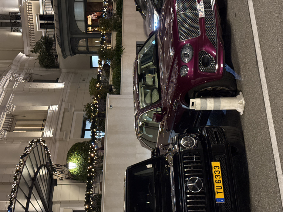 Two luxury cars, a dark-colored Mercedes-Benz G-Wagon and a burgundy Bentley, are parked side-by-side on a paved street. The G-Wagon displays a yellow license plate reading "TU 6333." A white traffic cone sits between the vehicles. In the background, a grand building with ornate architectural details and decorative lighting is visible.