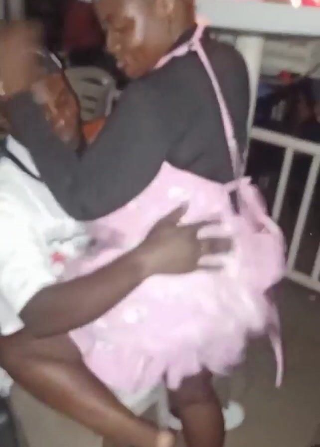 A man and a woman are dancing. The man is seated in a chair, and the woman is standing in front of him and appears to be sitting in his lap. The man is wearing a white shirt, tan pants, and a bandana. The woman is wearing a black top and a short, pink dress. The background is blurry, but it appears to be a bar or club with white fencing and a television set visible in the background. Loud music is audible.