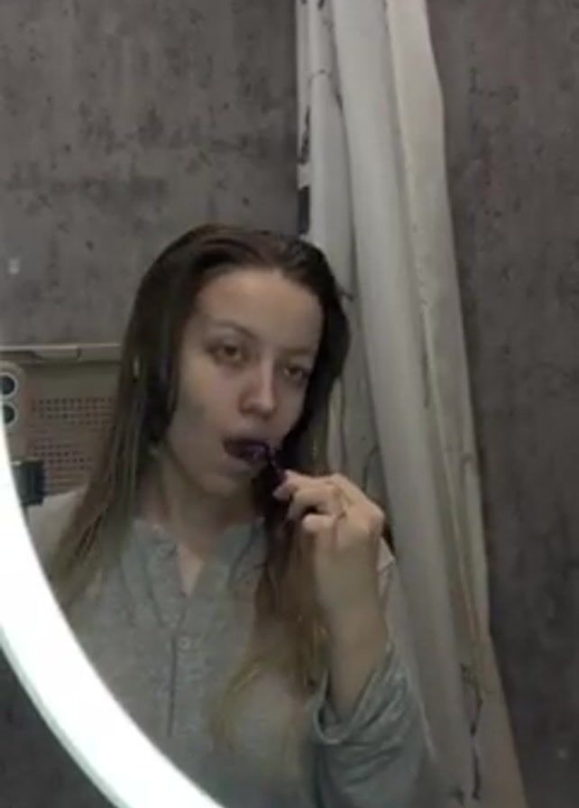 A young woman stands in front of a round, backlit mirror in a bathroom. She has wet, blonde hair and is wearing a gray, long-sleeved shirt. She holds a purple toothbrush and is brushing her teeth, looking directly at the camera. The bathroom has a gray, textured wall behind the mirror, and a white shower curtain is partially visible to the right. A phone in a protective case is attached to the mirror's frame to the left of the woman's head.