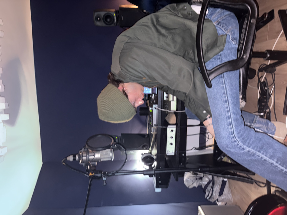 An indoor scene depicts a male individual within what appears to be a recording studio