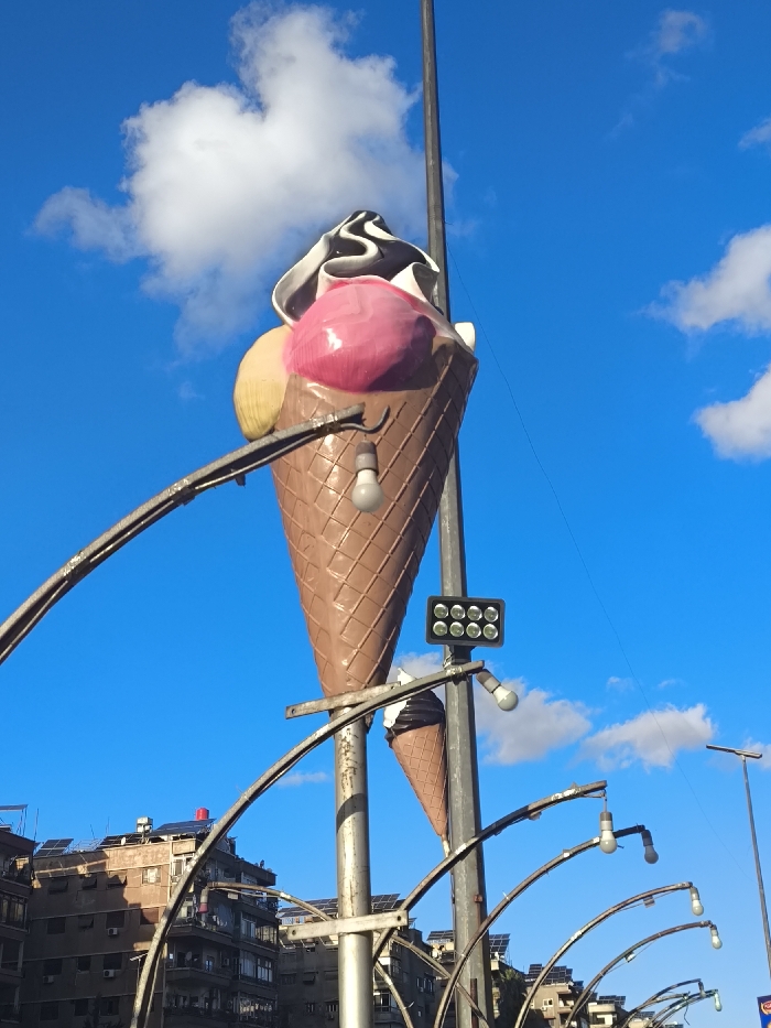 - "The scene depicts an urban street view in Sarouja Municipality, Syria, dominated by a large decorative ice cream cone sculpture mounted on a street pole against a bright blue sky with scattered white clouds" by FM-KeD0c2, licensed under CC BY 4.0