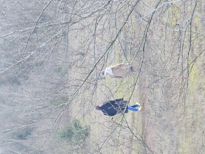 A person in a dark coat, blue jeans, and white shoes is standing on grassy ground. The scene is partially obscured by the intricate branches of bare trees. A cardboard box with white material is suspended among the branches, higher than the person. The background appears to be a grassy landscape with subtle variations in color. The overall tone is muted and natural.