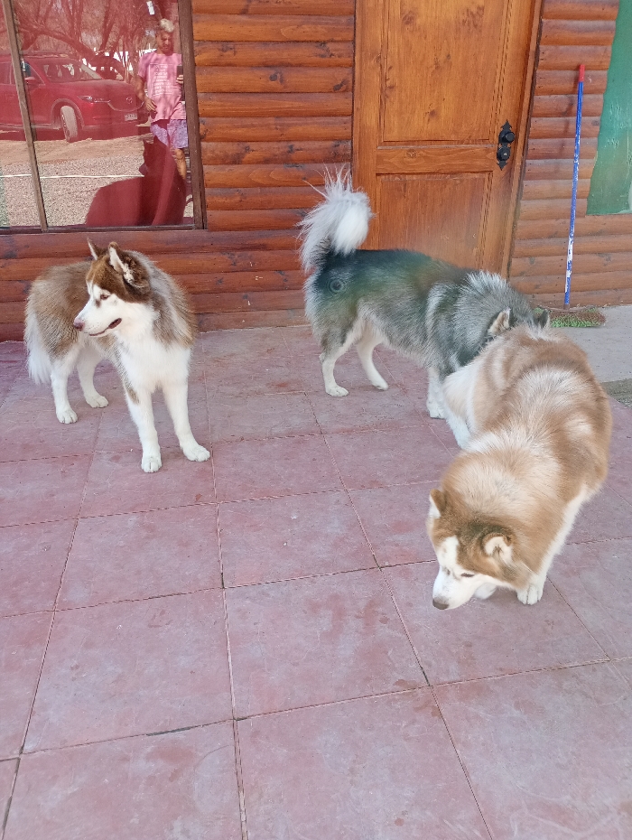 Three Huskies stand on reddish-brown tile. One, brown and white, stands facing left. Another, gray and white, has a plumed tail. The third, tan and white, looks downward. Behind them, a log cabin has a window reflecting a person and a red car. A wooden door is to the right, and a blue broom leans against the cabin. The scene appears outdoors.