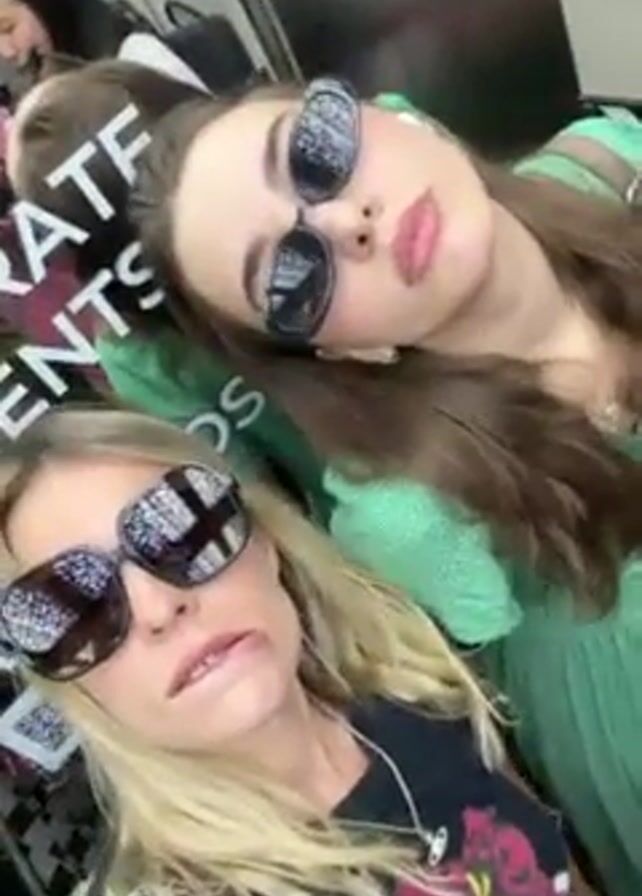 Two women pose for a selfie in what appears to be an elevator. The woman in the foreground has blonde hair, a black T-shirt with a graphic design, sunglasses, and braces. The woman behind her has long brown hair and is wearing a light green dress and sunglasses. A text overlay that says "CELEBRATE EVENTS, AWARDS" is partially visible. The elevator's interior is metallic, with reflections of other people visible.