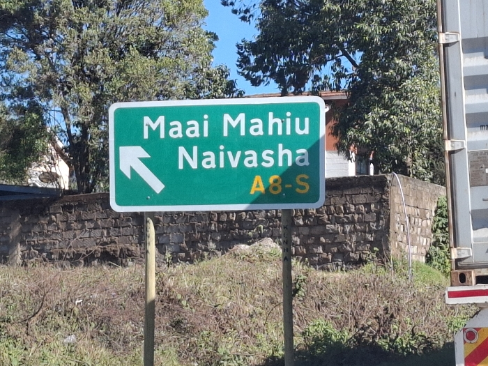 A green road sign mounted on a wooden post indicates a left turn towards Maai Mahiu and Naivasha, with the road designated as A8-S