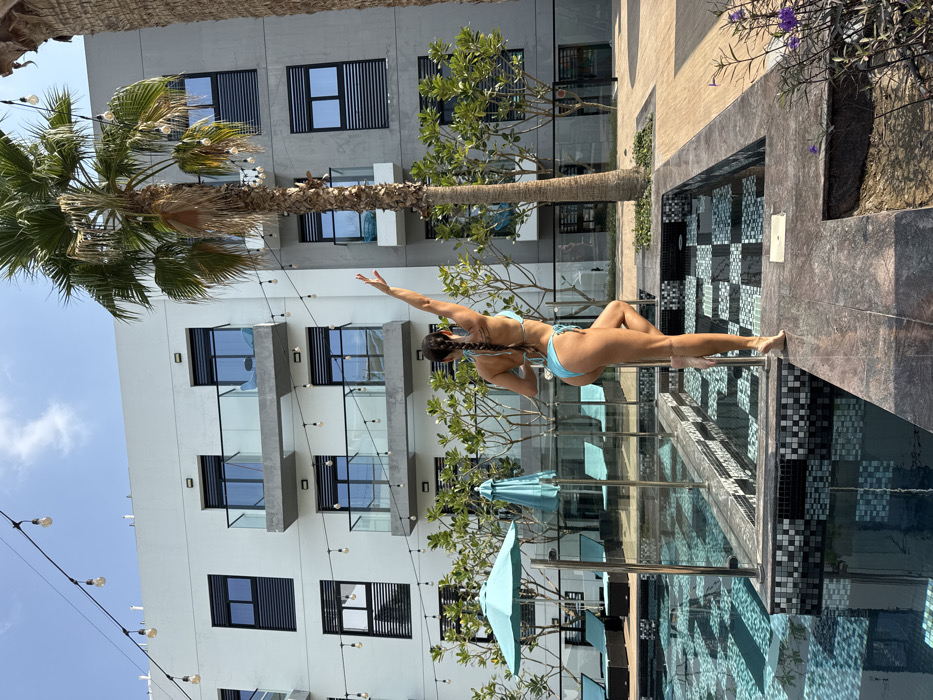 The image displays an outdoor leisure scene within Dubai, United Arab Emirates, under clear daylight conditions. A lone female subject is positioned in the center-right, balancing barefoot on her right leg on the dark tiled edge of an elevated, square-shaped pool. She is viewed from behind, wearing a light blue two-piece bikini, with her long braided hair extending down her back, and her right arm raised vertically. The elevated pool features an internal black and light-colored checkerboard tile pattern and is partially enclosed by a glass barrier. Adjacent to this, a larger swimming pool with light blue water is visible, accompanied by two open turquoise umbrellas and multiple matching lounge chairs positioned to the left. The pool area is bordered by green-leafed trees and two prominent palm trees, both wrapped with decorative string lights. In the background, a multi-story, light-colored building with numerous dark-framed windows and balconies featuring glass railings stands beneath a clear blue sky. A string of incandescent bulbs hangs diagonally across the upper portion of the frame.
