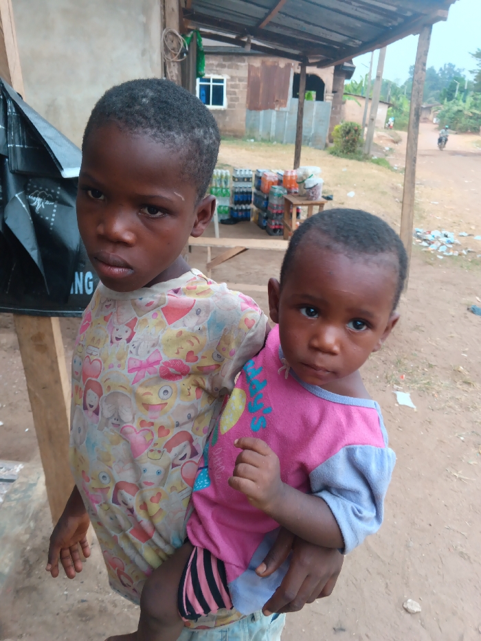 Two young African children are depicted outdoors. The older child holds the younger one, both facing the camera. The older child wears a light-colored emoji shirt, and the younger one is in a pink and blue top with striped bottoms. A building with drinks stocked on tables is visible in the background. A dirt road stretches in front, and a motorcycle drives on it in the distance. The scene seems to be in a rural setting.