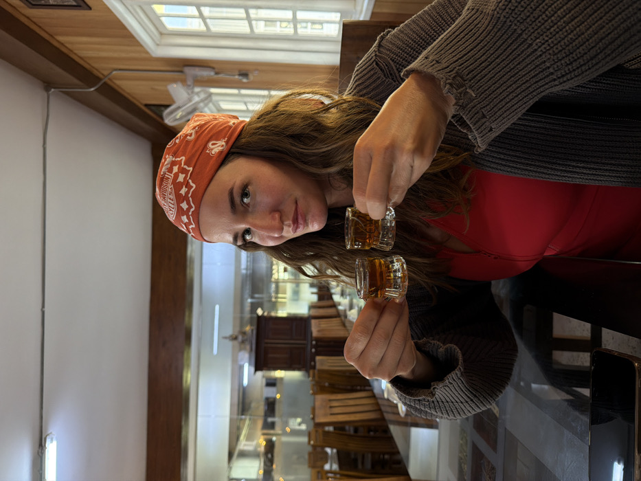 The image displays an adult female presenting two shot glasses within an indoor dining establishment located in Ramboda, Sri Lanka. The woman occupies the central foreground, characterized by long, wavy brown hair, blue eyes, and an orange bandana featuring a white "HARLEY-DAVIDSON CYCLES" pattern. She wears a red garment with a central zipper and a dark grey knitted cardigan. Her gaze is directed at the camera, exhibiting a slight smile. Each hand holds a small, clear glass shot glass containing an amber-colored liquid, with visible particulate matter or herbs. In the immediate foreground, a dark, reflective table surface is partially visible, with a smartphone resting on its left side. The background reveals an expanse of an empty dining area furnished with numerous wooden tables and high-backed wooden chairs. Behind this seating area, visible through a glass partition, is a dark wooden cabinet topped with a golden Buddha statue. The room's architecture includes a white ceiling with fluorescent tube lighting, a horizontal wooden beam, and a wood-paneled wall on the right side. This wall features multiple white-framed windows and a white wall-mounted oscillating fan. Exposed electrical conduit is visible on the ceiling and wall.