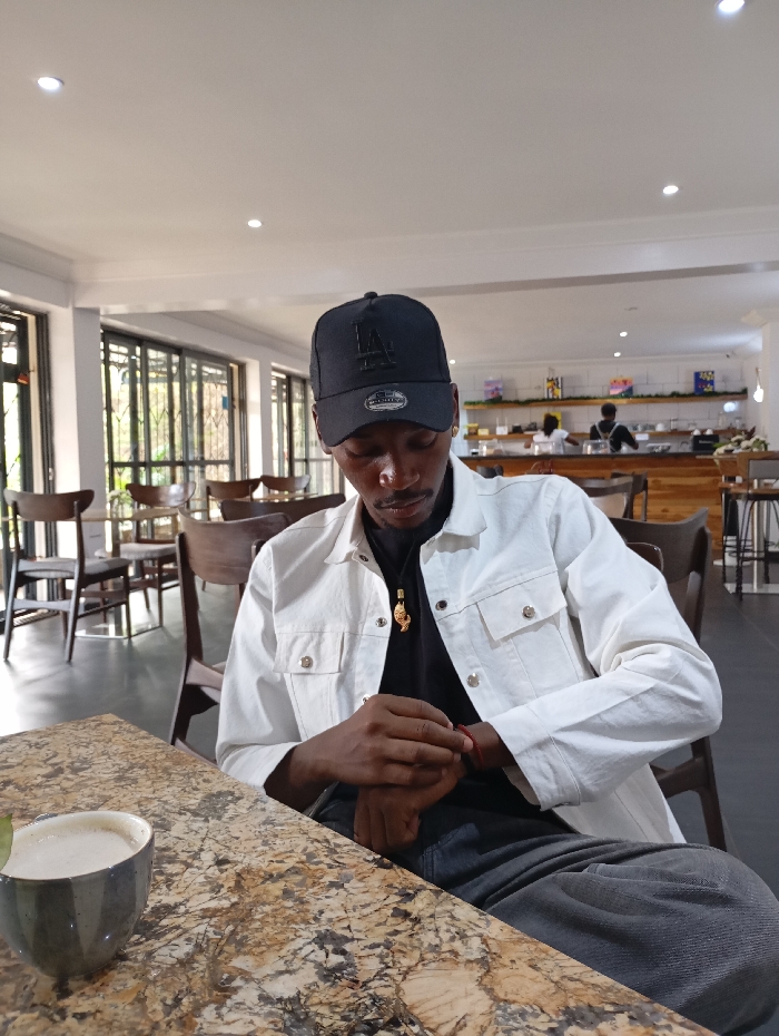 The image depicts an indoor scene within a modern cafe or restaurant. A male individual, appearing to be of African descent, is seated in the foreground at a table with a mottled brown and cream stone-like surface. He wears a black baseball cap featuring an "LA" logo and a "NEW ERA" sticker, a white collared jacket with silver snap buttons over a black t-shirt, and dark trousers. A golden-colored fish-shaped pendant hangs from a black cord around his neck. His gaze is directed downwards towards his left wrist, which his right hand is manipulating; a thin red cord or bracelet is visible on the wrist. A light grey ceramic mug containing a light-colored beverage with foam, garnished with a green leaf, is positioned on the table to his left. The background features large dark-framed windows on the left, showing a glimpse of green foliage outside, and additional wooden tables and chairs within the establishment. To the right, a long wooden counter with white shelving displaying various items is visible. Two individuals, consistent with staff, are partially observable behind the counter. The interior is brightly lit by recessed ceiling lights and features white walls. No specific identifying markers are present within the image to pinpoint an exact location within the city of Jos, Nigeria.