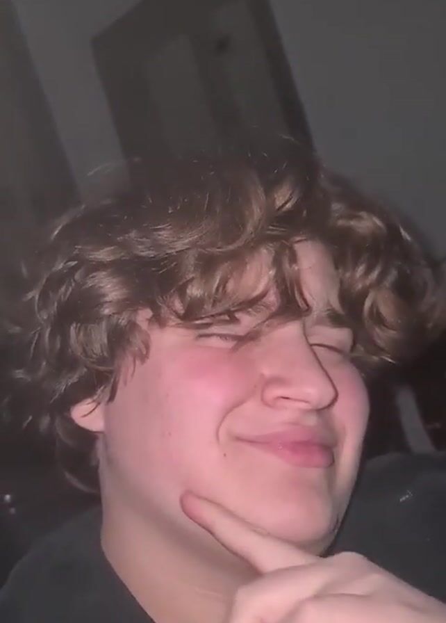 A young man with curly brown hair is centered in the frame. He has fair skin and is wearing a black shirt. He is making a kissing face and then closes his eyes and smiles. The background is out of focus but appears to be an indoor space with light-colored walls. The lighting is dim.