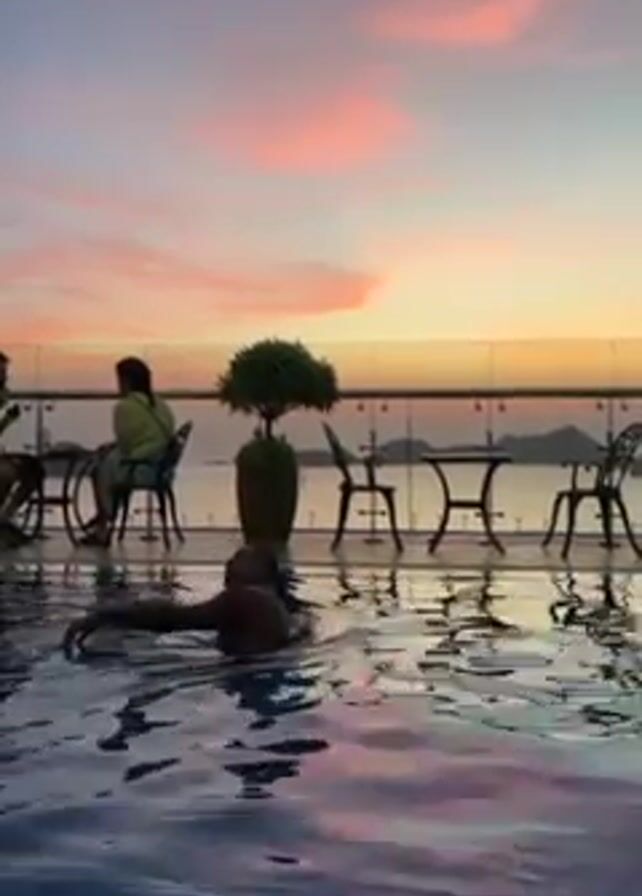 man swimming in a pool with a sunset in the background. Two people are sitting at a table by the pool. The pool appears to be on a rooftop terrace with a glass railing. There are additional tables and chairs on the terrace. A potted bush is visible. The sky is multicolored, with shades of pink, orange, and blue. The man in the pool is swimming towards the edge.